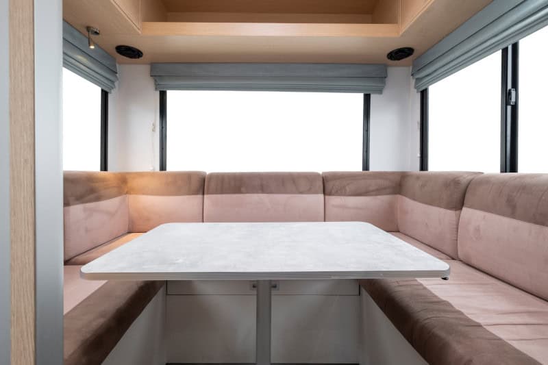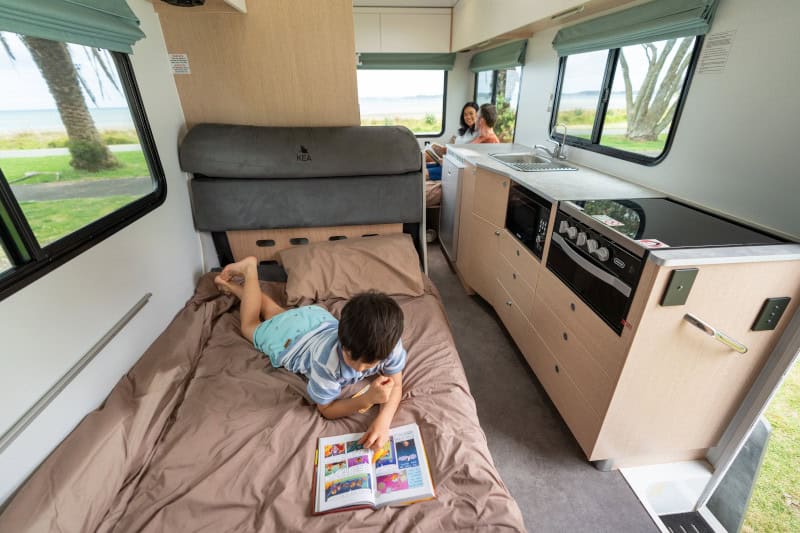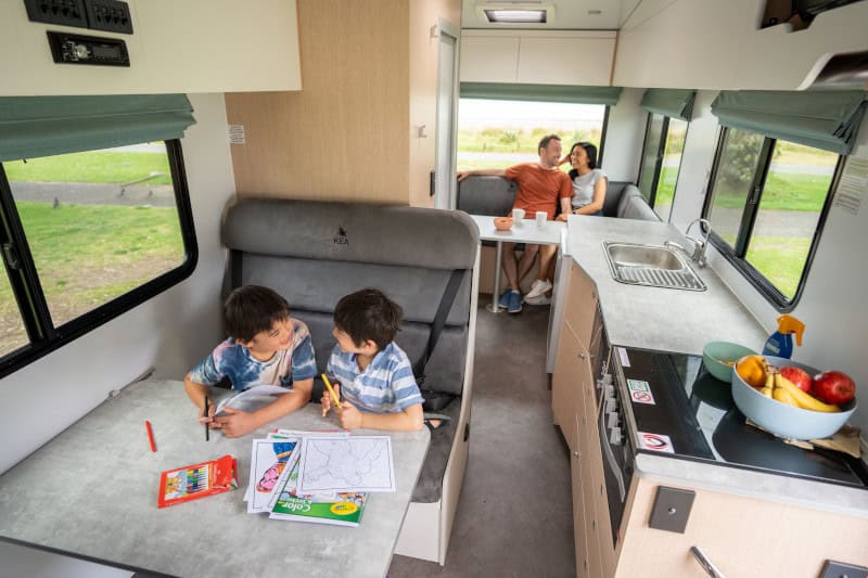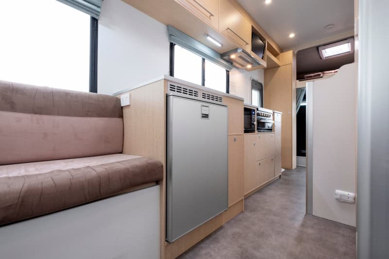 Experience true home-style comfort wherever your journey leads. The motorhome features a toilet and shower, reverse-cycle air conditioning and heating to keep you comfortable in every season, and a well-appointed kitchen complete with gas cooktop, refrigerator, and microwave.